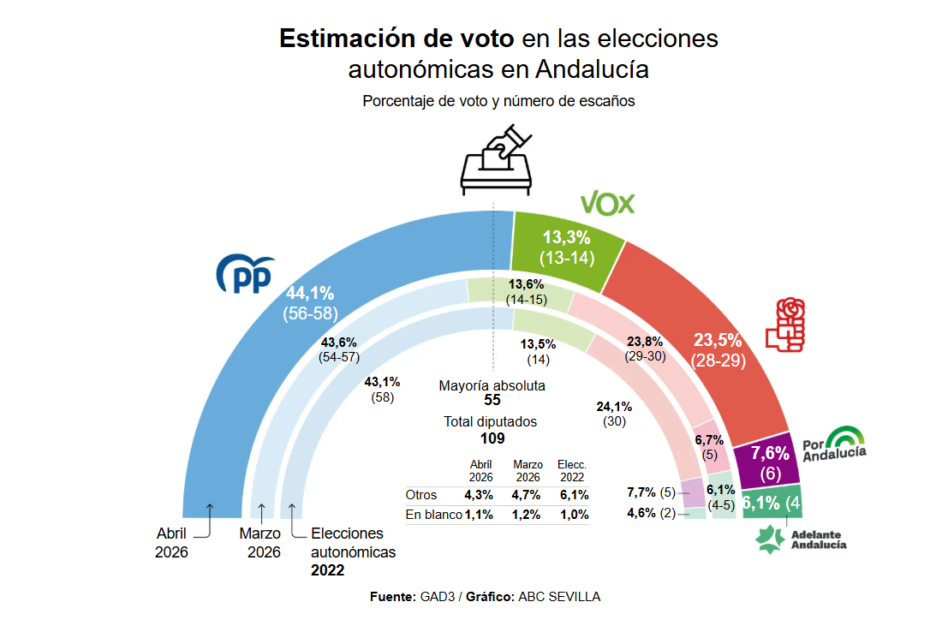🟢Encuesta ANDALUCÍA ABC: El PP revalida la mayoría absoluta (GAD3, Abr. 2026)