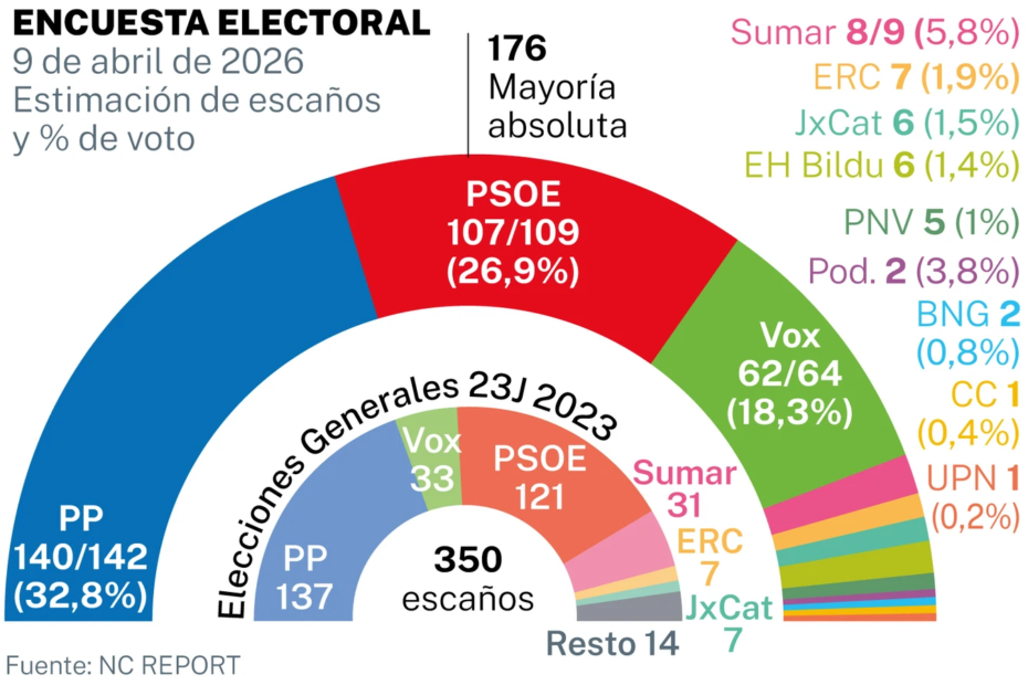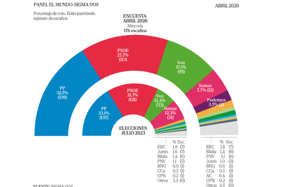 Media de encuestas abril: El PSOE remonta ligeramente mientras el PP se estanca y Vox pierde fuelle
