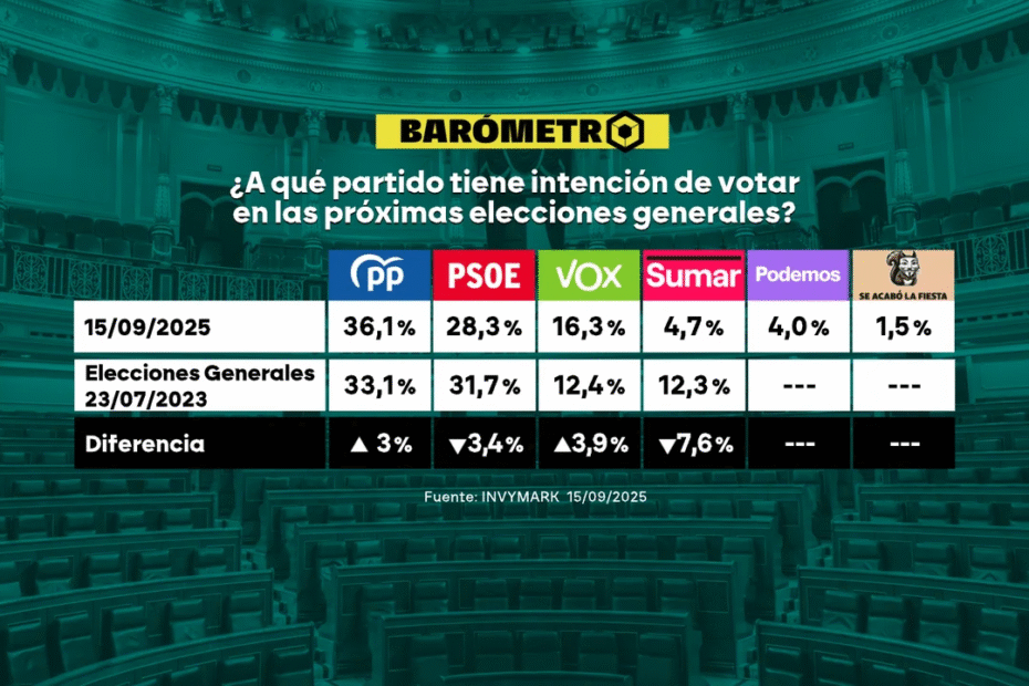 Encuesta elecciones generales de InvyMark para la Sexta (21 septiembre 2025): solo crece Vox, Podemos y Sumar empatan