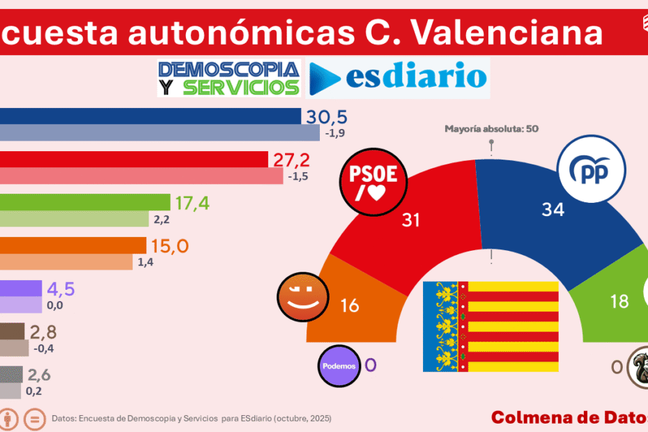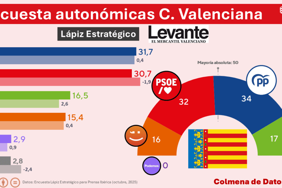 🍊 Encuesta elecciones autonómicas Comunidad VALENCIANA de Lápiz Estratégico para Prensa Ibérica (09 de octubre 2025): La derecha resiste un año después de la DANA por el avance de Vox