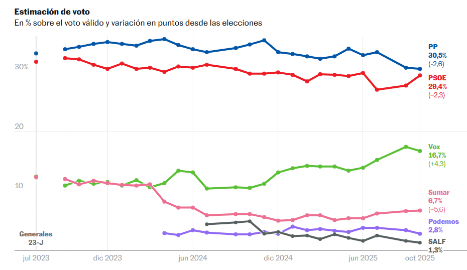 El PSOE se acerca a solo 1 puntos del PP y Vox frena su escalada