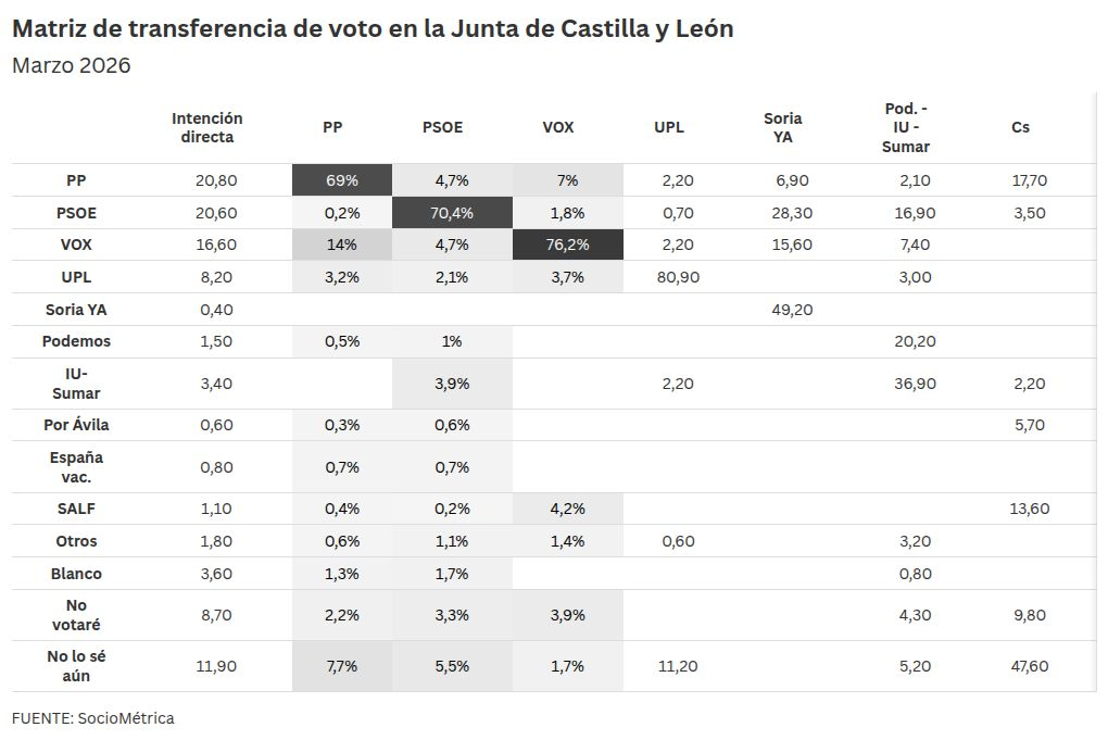 El último sondeo de SocioMétrica para El Español en Castilla y León, a menos de dos semanas de las elecciones del 15 de marzo, proyecta un escenario de terremoto político que rompe la tendencia de estabilidad que apuntaban otros sondeos: Vox supera por primera vez la barrera del 20% en una autonomía (20,8%), el PSOE se hunde hasta su peor resultado histórico (23-26 escaños), y el PP de Mañueco resiste pero ve cómo la ultraderecha le come terreno. La derecha mantiene la mayoría absoluta, pero el equilibrio interno se desplaza peligrosamente hacia Vox.