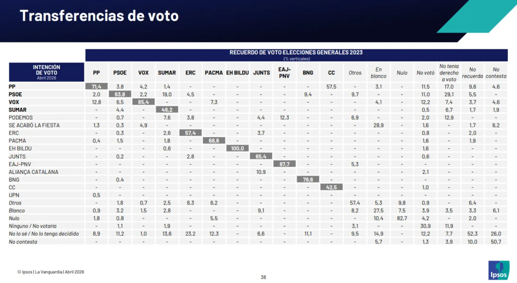 2. Matriz de transferencias: Es una matriz cuadrada de dimensión n×n (la imagen anterior de IPSOS es un ejemplo de ello), donde cada número recoge el porcentaje de votantes del partido j en las elecciones de 2023 que declaran intención de votar al partido i en la actualidad. Se obtiene cruzando la variable de recuerdo de voto (partido votado en las elecciones anteriores) con la variable de intención de voto (partido al que votaría hoy).